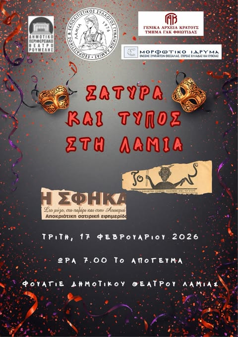 Ο Εξωραϊστικός και Εκπολιτιστικός Σύλλογος Γυναικών Λαμίας, τα Γενικά Αρχεία Κράτους Φθιώτιδας, το Δημοτικό Περιφερειακό Θέατρο Ρούμελης και το Μορφωτικό Ίδρυμα Ένωσης Συντακτών Θεσσαλίας-Στ. Ελλάδος-Ευβοίας συνδιοργανώνουν την εκδήλωση με τίτλο «Σάτιρα και Τύπος στη Λαμία».